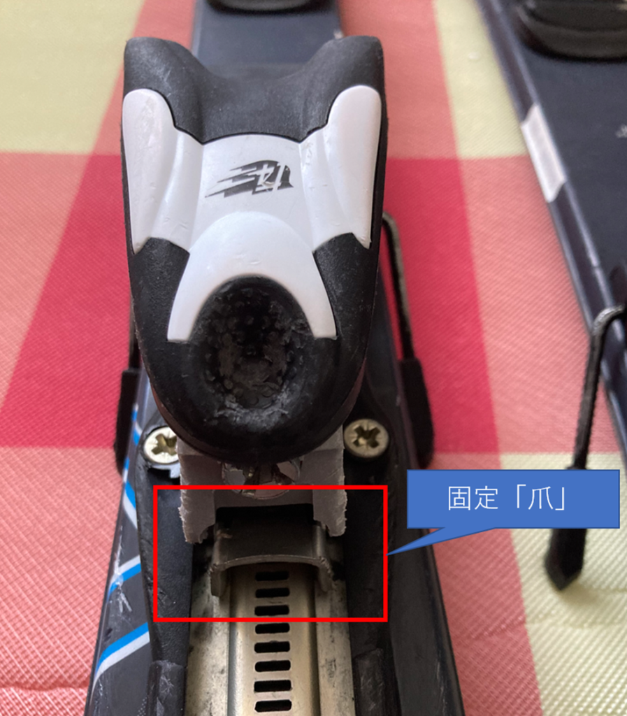以下画像のとおり、ヒールピースには(ほとんどの場合)ピースを固定する爪がついています